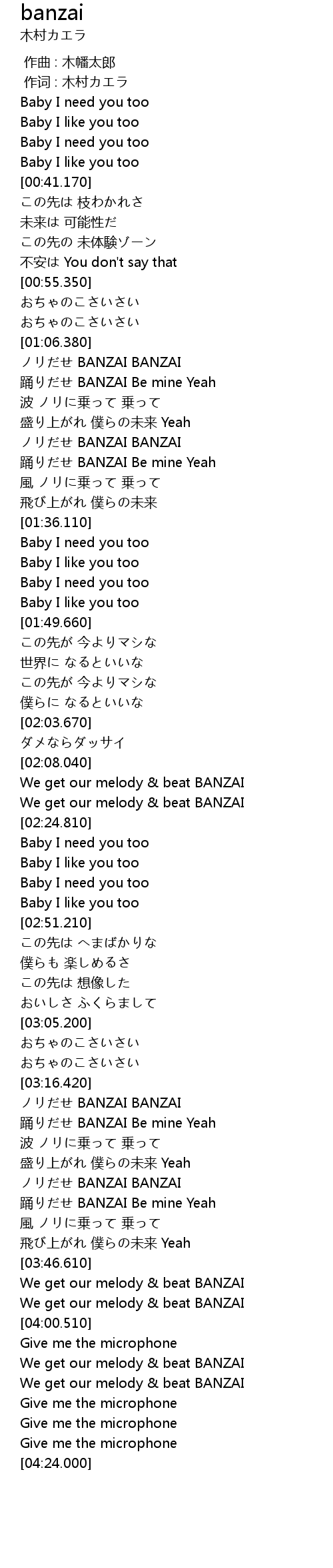 | [03:22.940] | 踊りだせ BANZAI Be mine Yeah |