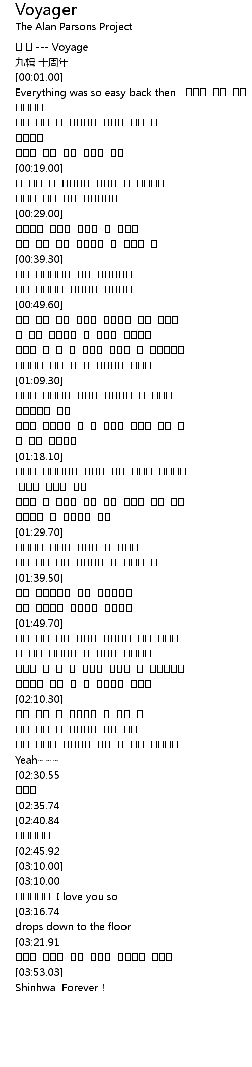 | [03:42.30][03:21.91] | 이젠 널 볼 수가 없다고 Say no more 한 순간만 이라도 너도 그때가 그림다고 말해줘 |