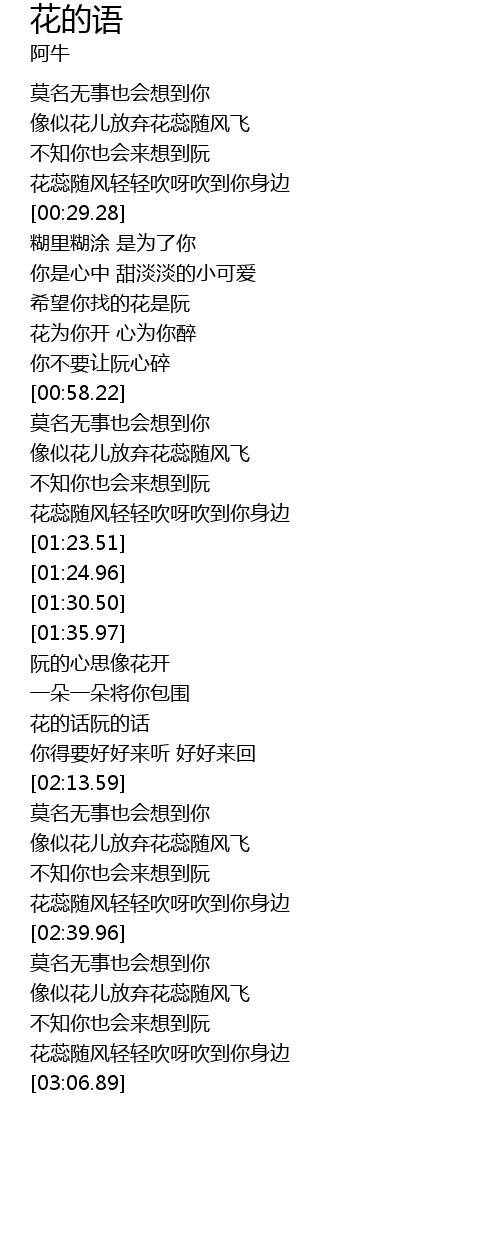 | [01:15.65] | 花蕊随风轻轻吹呀吹到你身边 |