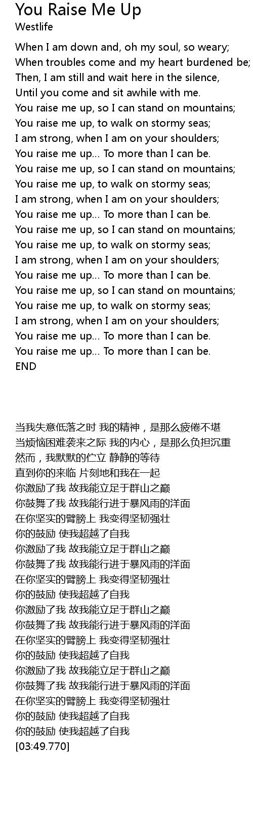 | [02:28.150] | You raise me up, so I can stand on mountains |