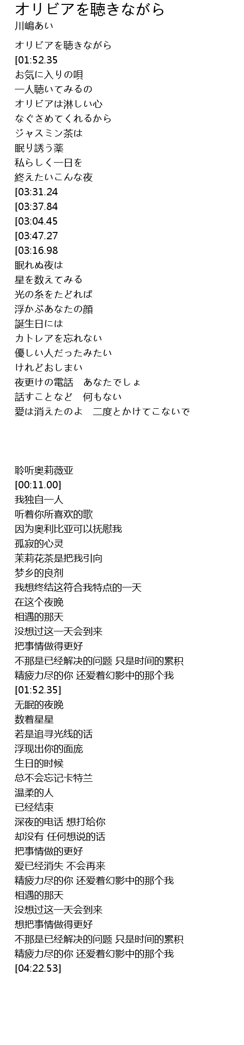 | [01:33.34][03:16.98][03:57.12] | 疲れ果てたあなた 私の幻を愛したの |