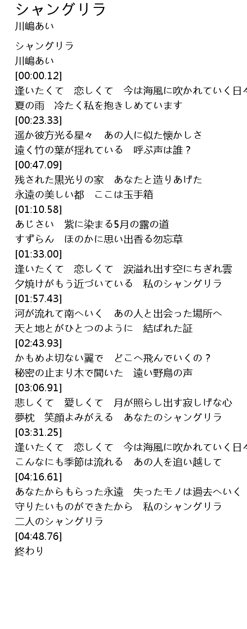 | [03:19.47] | 夢枕 笑顔よみがえる あなたのシャングリラ |