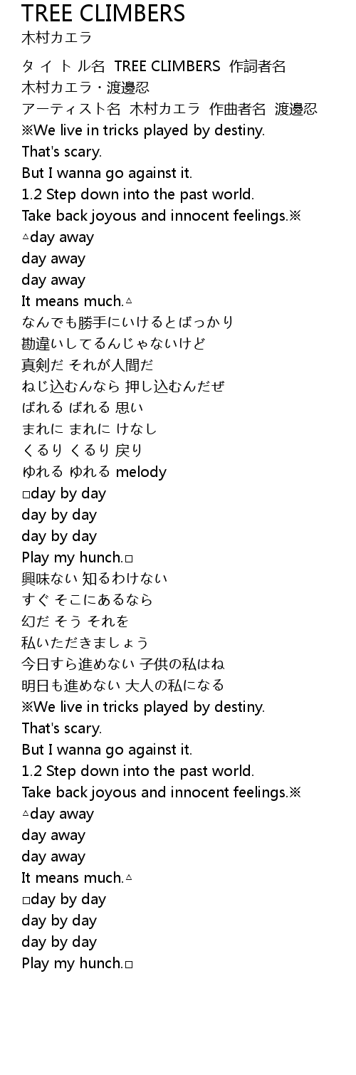 | [00:09.21] | タ イ ト ル名 TREE CLIMBERS 作詞者名 木村カエラ・渡邊忍 |