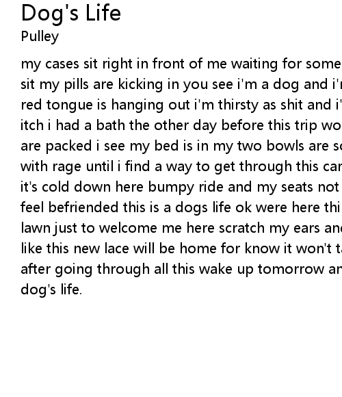 | my cases sit right in front of me waiting for someone to take my away alone i sit my pills are kicking in you see i'm a dog and i'm locked in my cage eyes are red tongue is hanging out i'm thirsty as shit and i'm still a dog fleas don't itch i had a bath the other day before this trip wonder where were going toys are packed i see my bed is in my two bowls are somewhere in reach i'll scratch with rage until i find a way to get through this cardboard that sits under me it's cold down here bumpy ride and my seats not first class, man's best friend i feel befriended this is a dogs life ok were here things are ok again a brand new lawn just to welcome me here scratch my ears and i'll chase down your ball looks like this new lace will be home for know it won't take much to go back to sleep after going through all this wake up tomorrow and we'll do it again living a dog's life. |