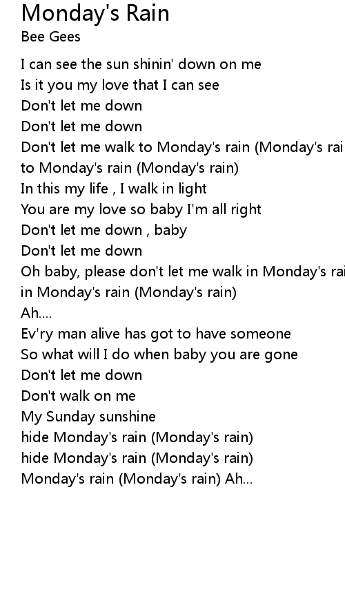 Oh baby, please don't let me walk in Monday's rain (Monday's rain) |