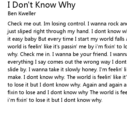 Check me out. Im losing control. I wanna rock and roll. But everything I planed just sliped right through my hand. I dont know why. Im a nice guy. I wanna take it easy baby But every time I start my world falls apart. I dont know why. The world is feelin' like it's passin' me by i'm fixin' to lose it but I dont know why. Check me in. I wanna be your friend. I wanna be your lover baby But everything I say comes out the wrong way I dont know why. So I guess i'll let it slide by. I wanna take it slowly honey. I'm feelin' like a fake every move I make. I dont know why. The world is feelin' like it's passin' me by i'm fixin' to lose it but I dont know why. Again and again and again and again I try. im fixin to lose and I dont know why The world is feelin' like it's passin' me by i'm fixin' to lose it but I dont know why. |