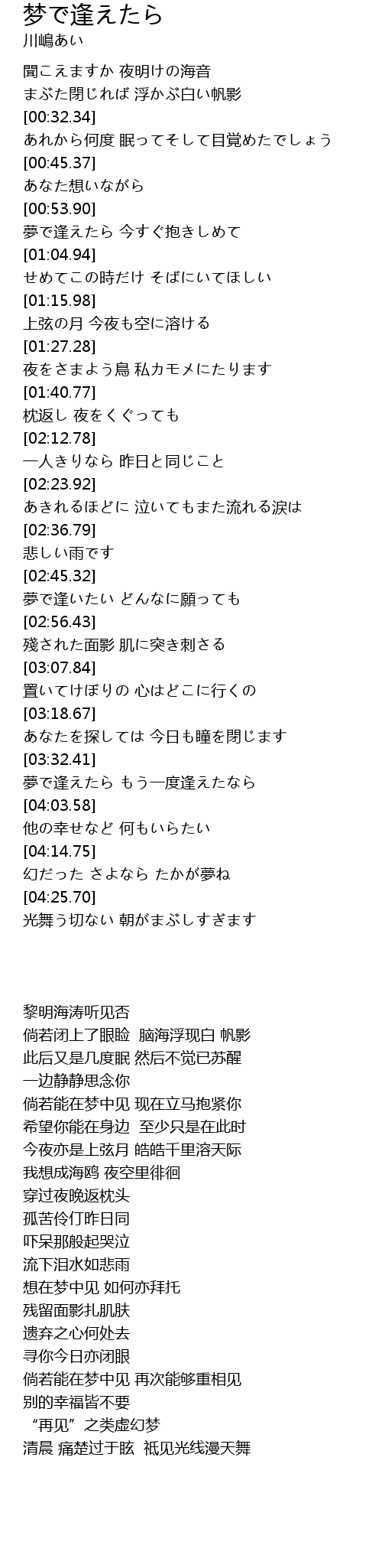 | [03:54.25] | 夢で逢えたら もう一度逢えたなら |