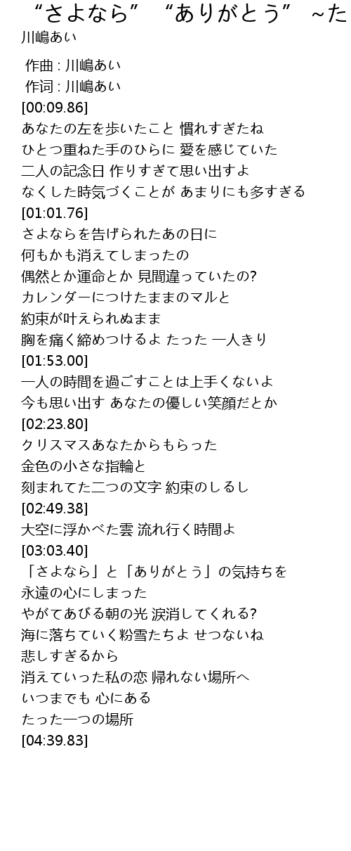 | [00:01.00] | 作词 : 川嶋あい |