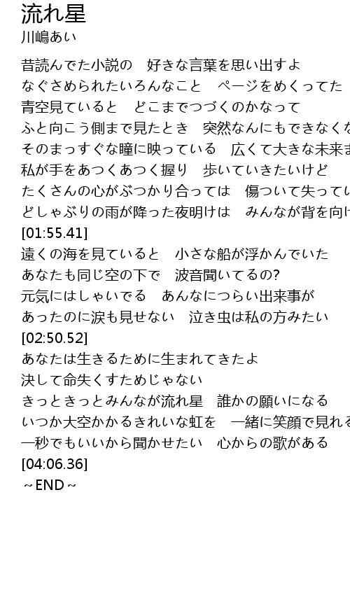 | [03:28.19] | きっときっとみんなが流れ星 誰かの願いになる |