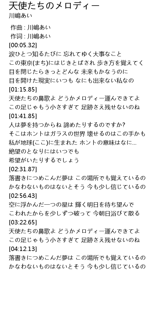 | [03:47.43] | 天使たちの鼻歌よ どうかメロディー運んできてよ |