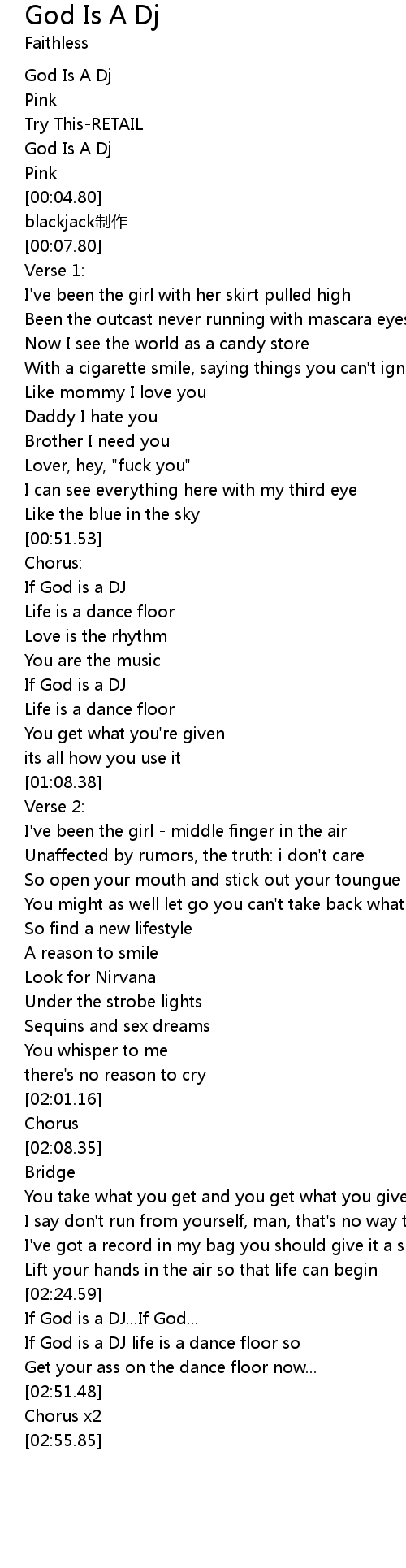| [02:46.52] | If God is a DJ life is a dance floor so |