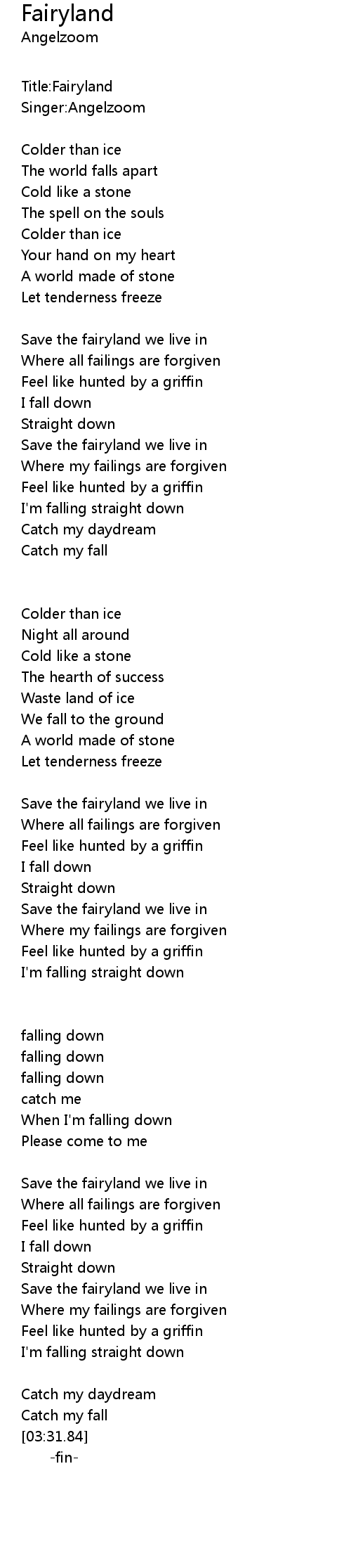 | [03:20.15] | I' m falling straight down |