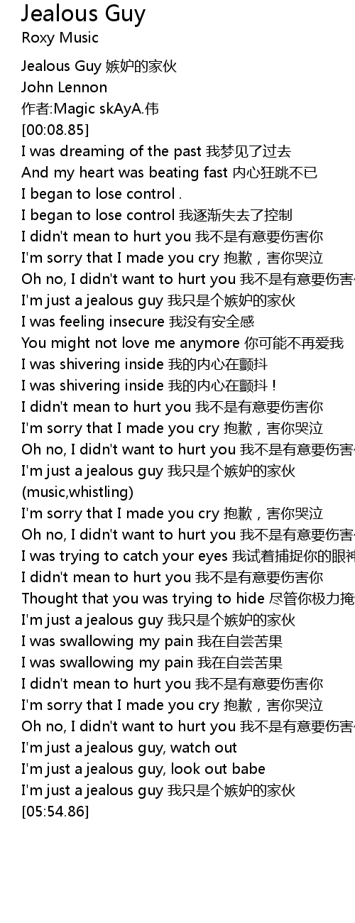 | [05:54.15] | I' m just a jealous guy wǒ zhǐ shì gè jí dù de jiā huo |