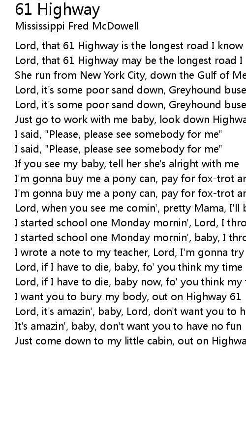 Lord, when you see me comin', pretty Mama, I'll be on Highway 61 |