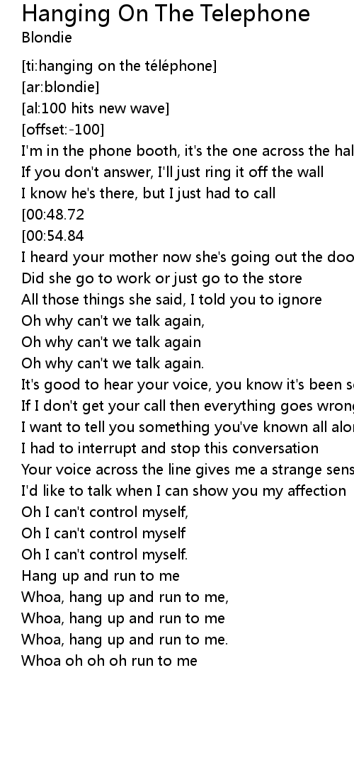| [00:15.64][00:48.72] | Don't leave me hanging on the telephone, |