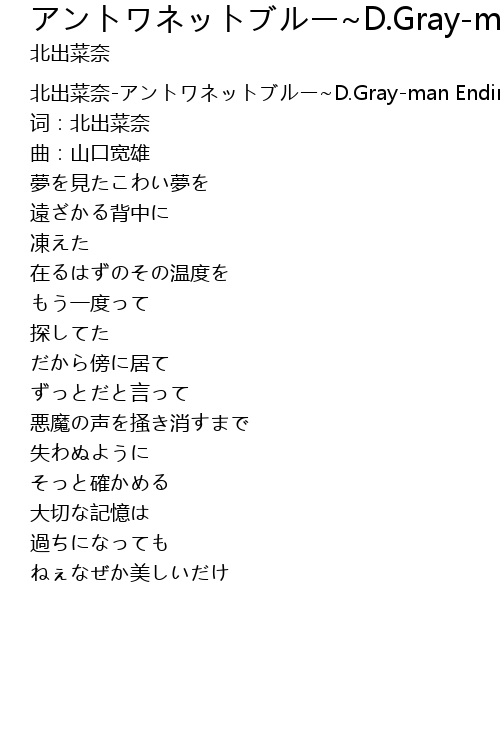 | [00:00.417] | 北出菜奈-アントワネットブルー~D.Gray-man Ending Ver.~ |