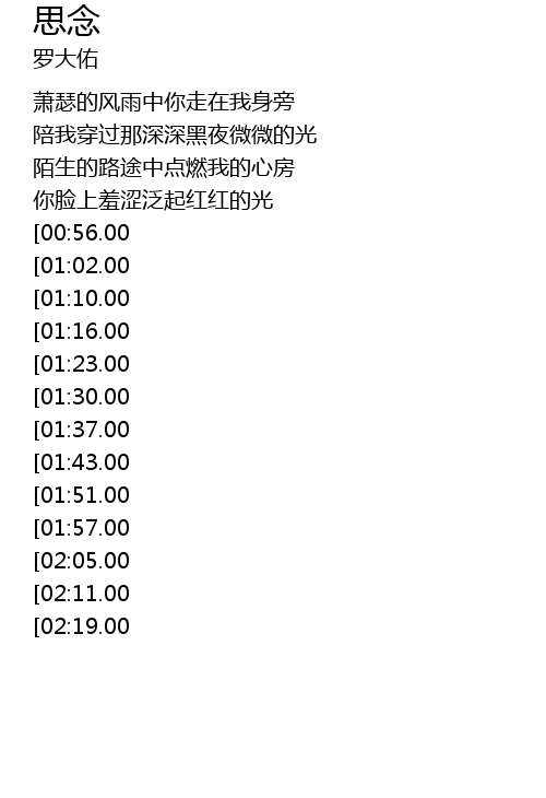 | [02:47.00][00:56.00] | xiāo sè de fēng yǔ zhōng děng dài wǒ de xīn qíng |