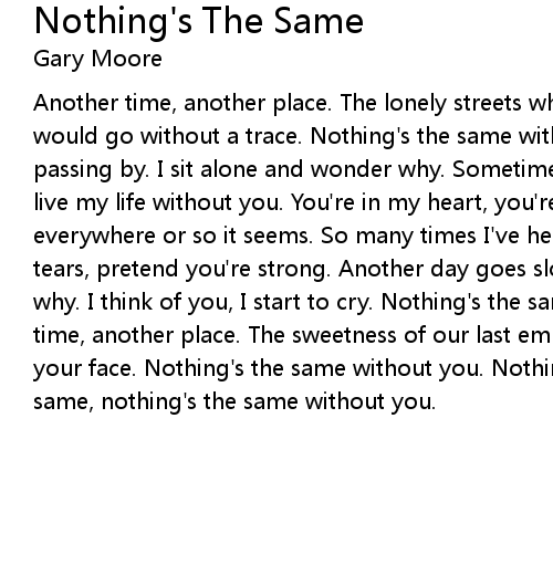 Another time, another place. The lonely streets where we embraced. Then you would go without a trace. Nothing's the same without you. Another day goes passing by. I sit alone and wonder why. Sometimes it's hard, but I will try To live my life without you. You're in my heart, you're in my dreams. You're everywhere or so it seems. So many times I've heard that song. Hold back the tears, pretend you're strong. Another day goes slowly by. I sit alone and wonder why. I think of you, I start to cry. Nothing's the same without you. Another time, another place. The sweetness of our last embrace. What would I give to see your face. Nothing's the same without you. Nothing's the same, nothing's the same, nothing's the same without you. |