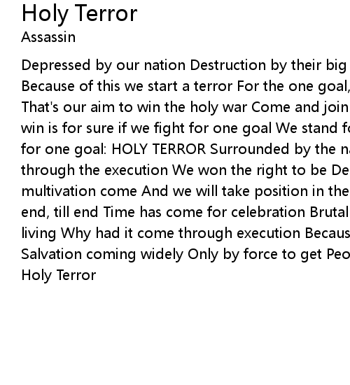 Depressed by our nation Destruction by their big army The reality no one sees Because of this we start a terror For the one goal, we fight for Holy Terror That's our aim to win the holy war Come and join us against the government The win is for sure if we fight for one goal We stand for all till our death Fight for one goal: HOLY TERROR Surrounded by the nation We try to get us free And through the execution We won the right to be Death of the parliamentation Make multivation come And we will take position in the new government Till end, till end, till end Time has come for celebration Brutal terror start No hope for living Why had it come through execution Because on this we start a terror Salvation coming widely Only by force to get People of all classes Fight for Holy Terror |