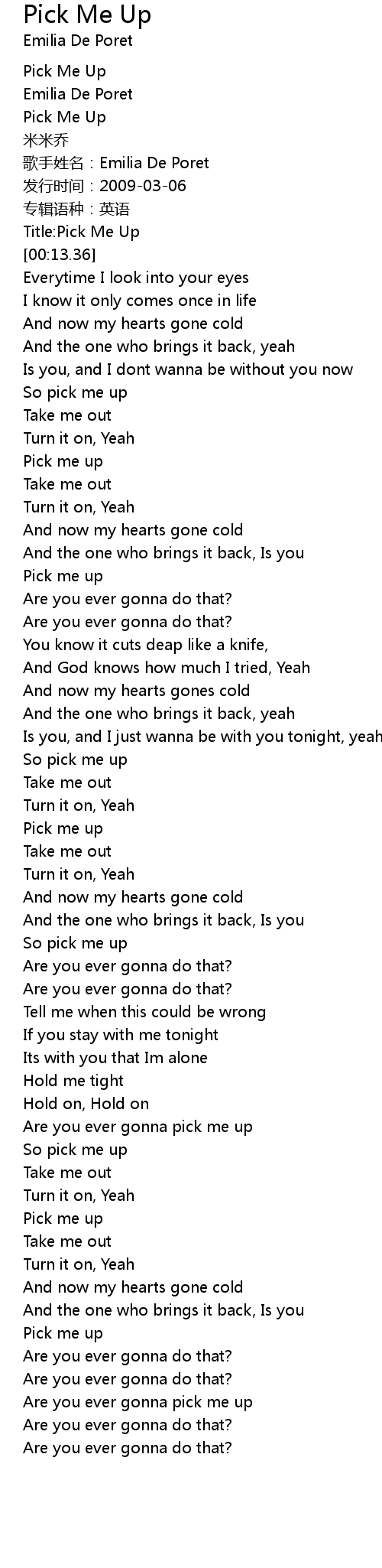 | [03:12.42] | Are you ever gonna pick me up |