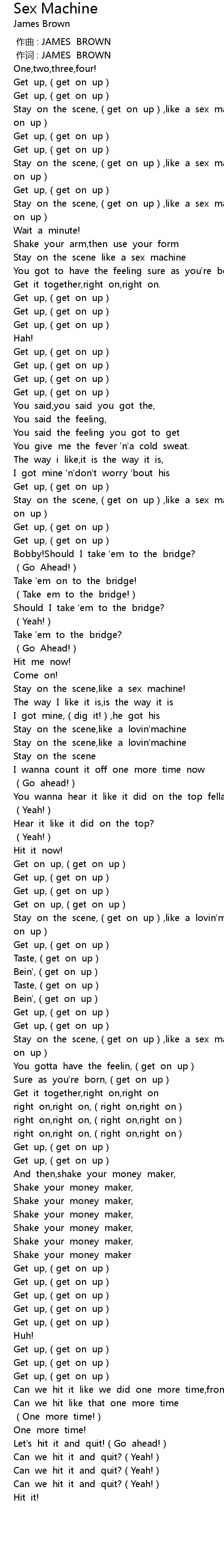 | [01:54.46] | Stay on the scene, get on up, like a sex machine, get on up |