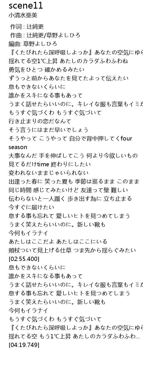 | [04:09.927] | 揺れてる空 もう1℃上昇 あたしのカラダふわふわ… |