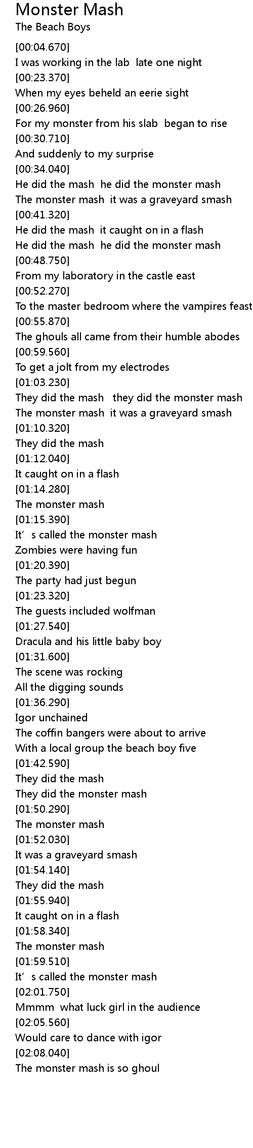 | [02:00.250] | It’s called the monster mash |