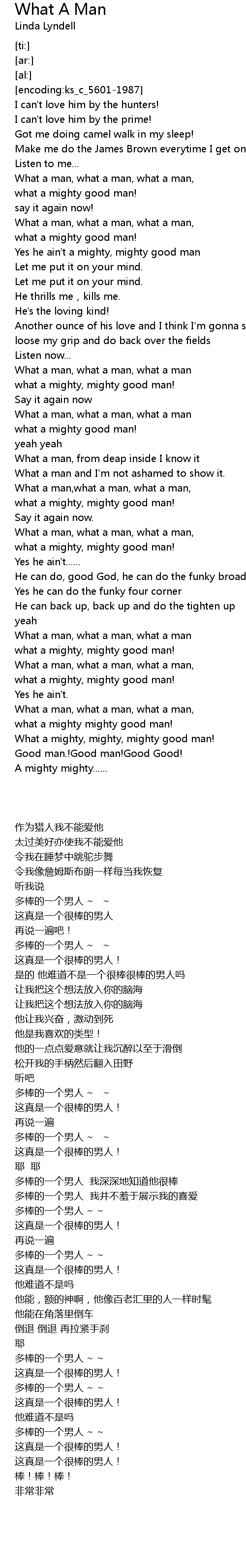 | [01:18.13] | What a man, what a man, what a man |