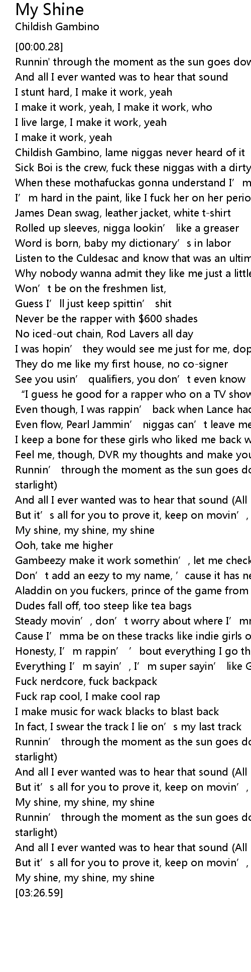 | [00:23.34] | Childish Gambino, lame niggas never heard of it |