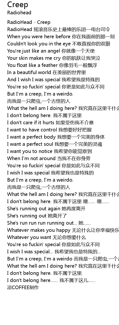 | [03:26.00] | But I' m a creep, I' m a weirdo ér wǒ shì yì zhī pá chóng, yí gè gǔ guài de rén |