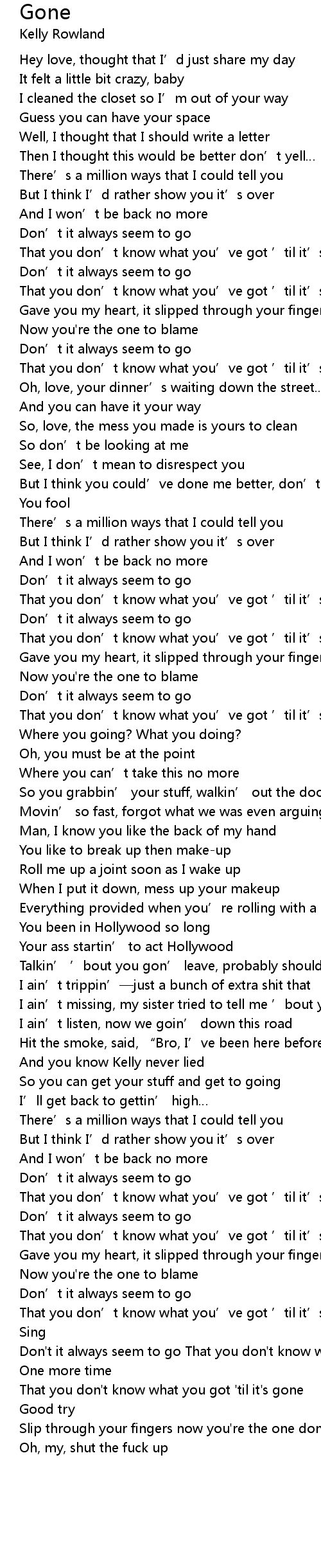 | That you don' t know what you got ' til it' s gone | |