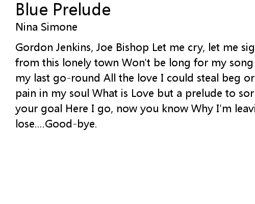 | Gordon Jenkins, Joe Bishop Let me cry, let me sigh When I'm blue Let me go way from this lonely town Won't be long for my song Will be thru Cause I know I'm on my last go-round All the love I could steal beg or borrow Wouldn't heal all this pain in my soul What is Love but a prelude to sorrow With heartache ahead for your goal Here I go, now you know Why I'm leaving Got the Blues, What can I lose....Good-bye. |
