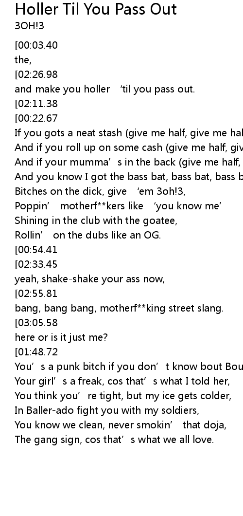 | [02:39.56][02:26.98][01:22.95][01:10.09][00:09.74] | I' ma hit you from the back and make you holler ' til you pass out. |