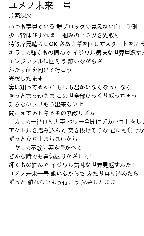 | ユメノ未来一号 歌いながらさ ふたり乗り込んだら | |