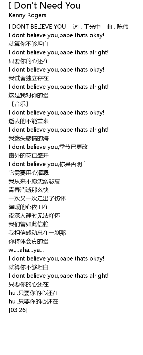 | [00:00] | I DONT BELIEVE YOU 词∶于光中 曲∶陈伟 |