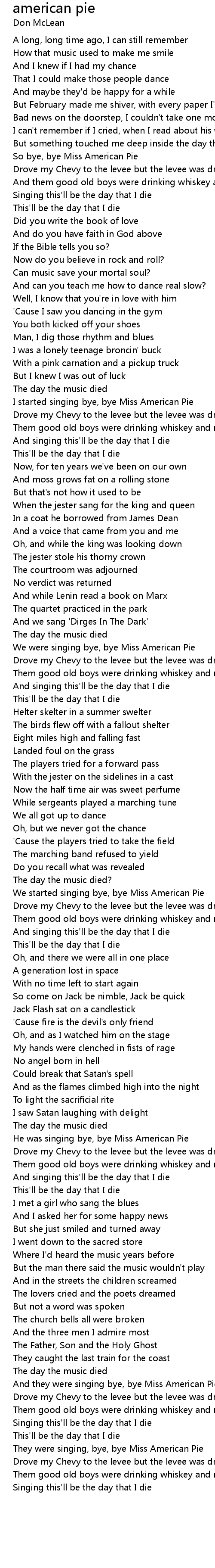 They were singing, bye, bye Miss American Pie |