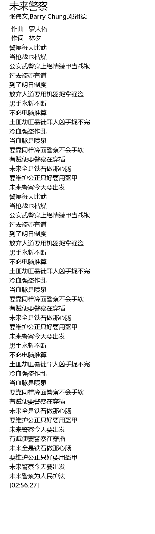 | [02:49.64] | wèi lái jǐng chá wéi rén mín hù fǎ |