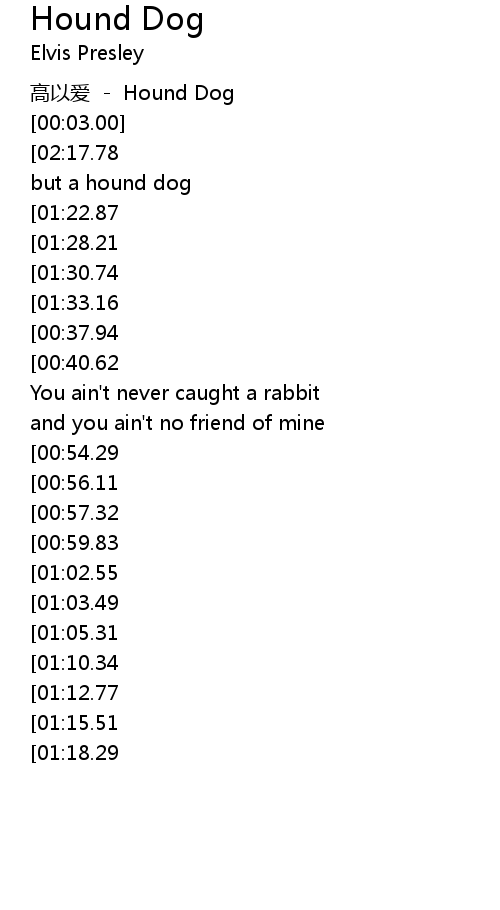 | [02:22.35][02:17.78][01:25.37][01:20.53][00:18.69][00:09.67] | You ain' t nothin' but a hound dog |