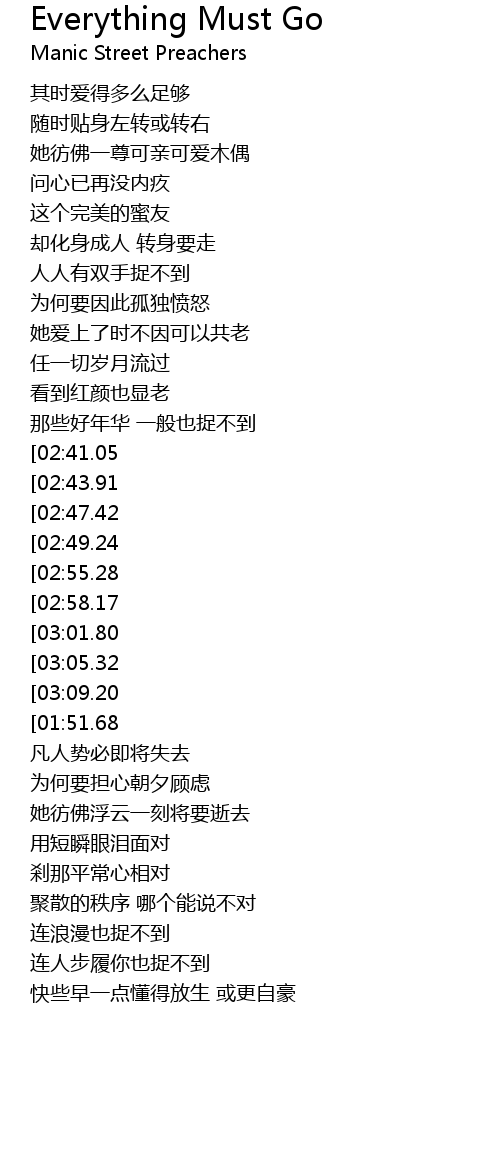 | [03:55.74][03:09.20][01:46.80] | Everything must go |