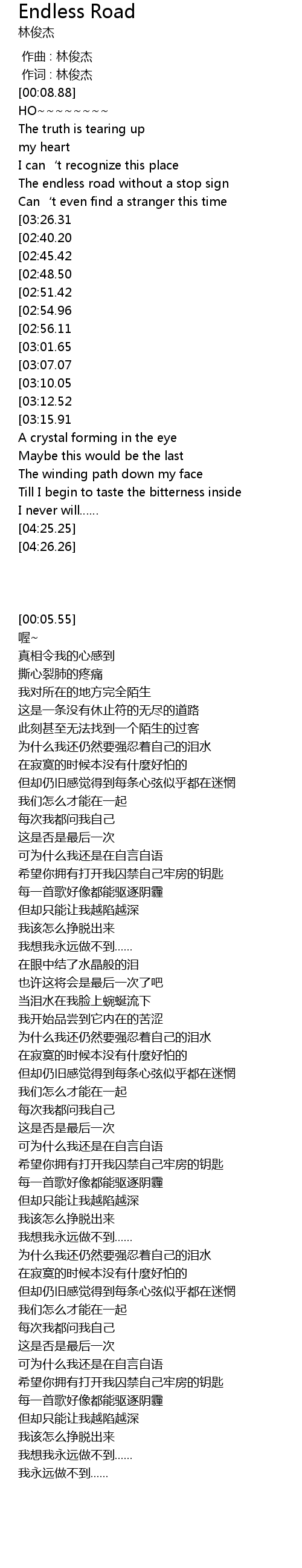 | [00:51.26][03:26.31][02:34.32] | Why am I still holding back my tears |
