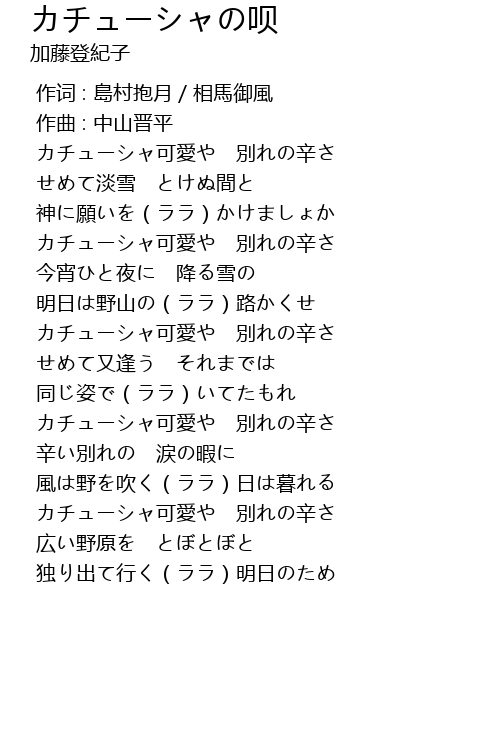| [03:01.747] | カチューシャ可愛や 別れの辛さ |