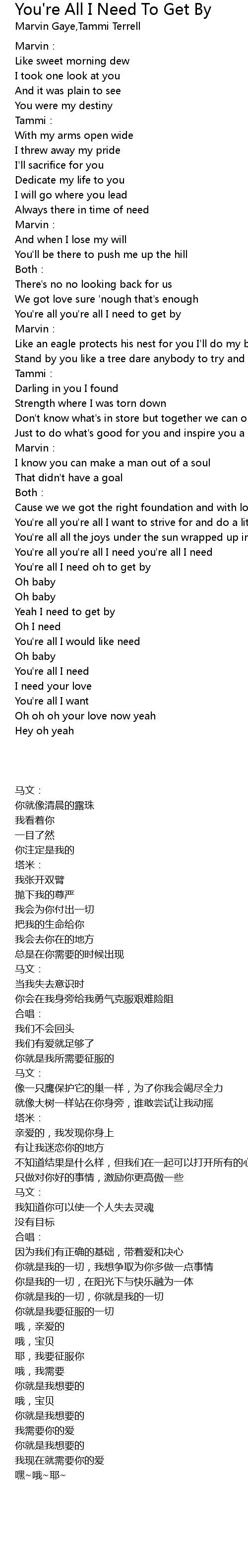 | Song | You're All I Need To Get By |