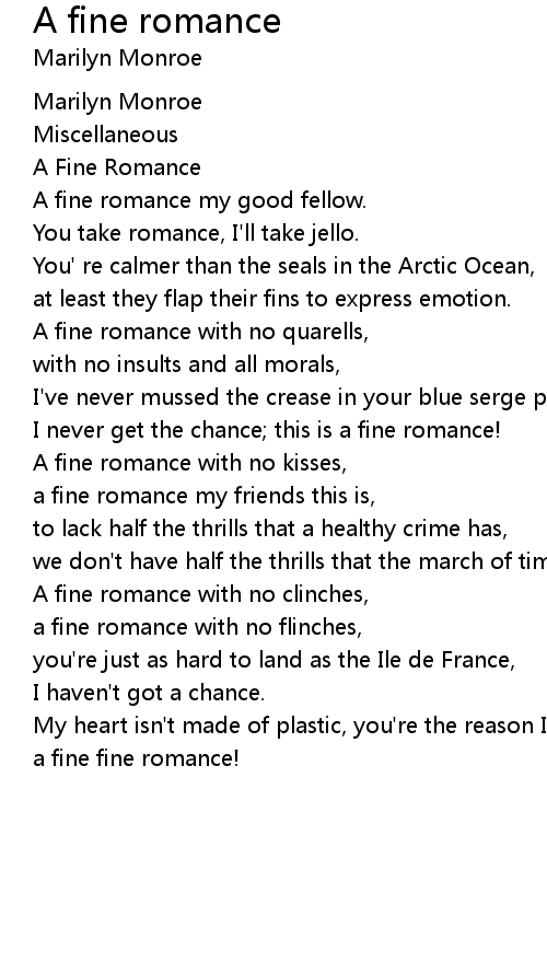 My heart isn't made of plastic, you're the reason I'm sarcastic; 'cause this is a fine fine romance! |
