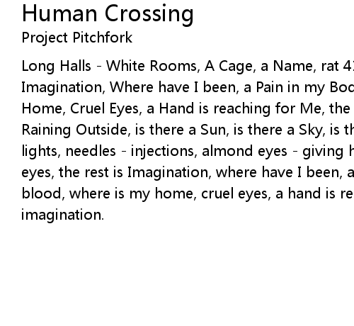 Long Halls - White Rooms, A Cage, a Name, rat 41 - Distress, the rest is Imagination, Where have I been, a Pain in my Body, I taste Blood, Where is my Home, Cruel Eyes, a Hand is reaching for Me, the rest is Imagination, is it Raining Outside, is there a Sun, is there a Sky, is the Compassion, dazzling lights, needles - injections, almond eyes - giving hope, in the night, almond eyes, the rest is Imagination, where have I been, a pain in my body, I taste blood, where is my home, cruel eyes, a hand is reaching for me, the rest is imagination. |