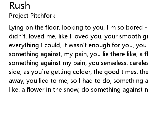 | Lying on the floor, looking to you, I m so bored so bored, what if you didn t, loved me, like I loved you, your smooth grace, pleased me, I gave you, everything I could, it wasn t enough for you, you lied to me, so I had to do, something against, my pain, you lie there like, a flower in the snow, do something against my pain, you senseless, careless, nothing, I m lying by your side, as you re getting colder, the good times, the bad times we had, now fade away, you lied to me, so I had to do, something against, my pain, you lie there like, a flower in the snow, do something against my pain. |