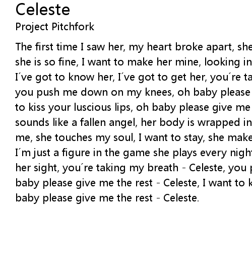 | The first time I saw her, my heart broke apart, she is dancing like a goddess, she is so fine, I want to make her mine, looking in her eyes, makes me realize, I ve got to know her, I ve got to get her, you re taking my breath Celeste, you push me down on my knees, oh baby please give me the rest Celeste, I want to kiss your luscious lips, oh baby please give me the rest Celeste, her voice sounds like a fallen angel, her body is wrapped in black leather, she attracts me, she touches my soul, I want to stay, she makes me rise, then she turns away, I m just a figure in the game she plays every night, with every man who catches her sight, you re taking my breath Celeste, you push me down on my knees, oh baby please give me the rest Celeste, I want to kiss you luscious lips, oh baby please give me the rest Celeste. |