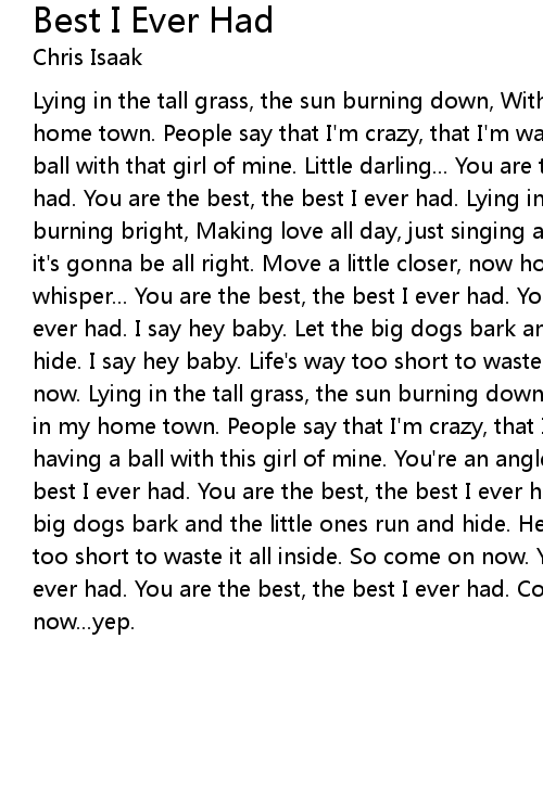 Lying in the tall grass, the sun burning down, With the best looking girl in my home town. People say that I'm crazy, that I'm wasting my time, But I'm having a ball with that girl of mine. Little darling... You are the best, the best I ever had. You are the best, the best I ever had. Lying in the tall grass, the sun burning bright, Making love all day, just singing all night. Everything's ok, it's gonna be all right. Move a little closer, now hold me tight. Then whisper... You are the best, the best I ever had. You are the best, the best I ever had. I say hey baby. Let the big dogs bark and the little ones run and hide. I say hey baby. Life's way too short to waste it all inside. So come on now. Lying in the tall grass, the sun burning down, With the best looking girl in my home town. People say that I'm crazy, that I'm wasting my time, But I'm having a ball with this girl of mine. You're an angle... You are the best, the best I ever had. You are the best, the best I ever had. I say hey baby. Let the big dogs bark and the little ones run and hide. Hey I say hey baby. Life's way too short to waste it all inside. So come on now. You are the best, the best I ever had. You are the best, the best I ever had. Come on now...ya... come on now...yep. |