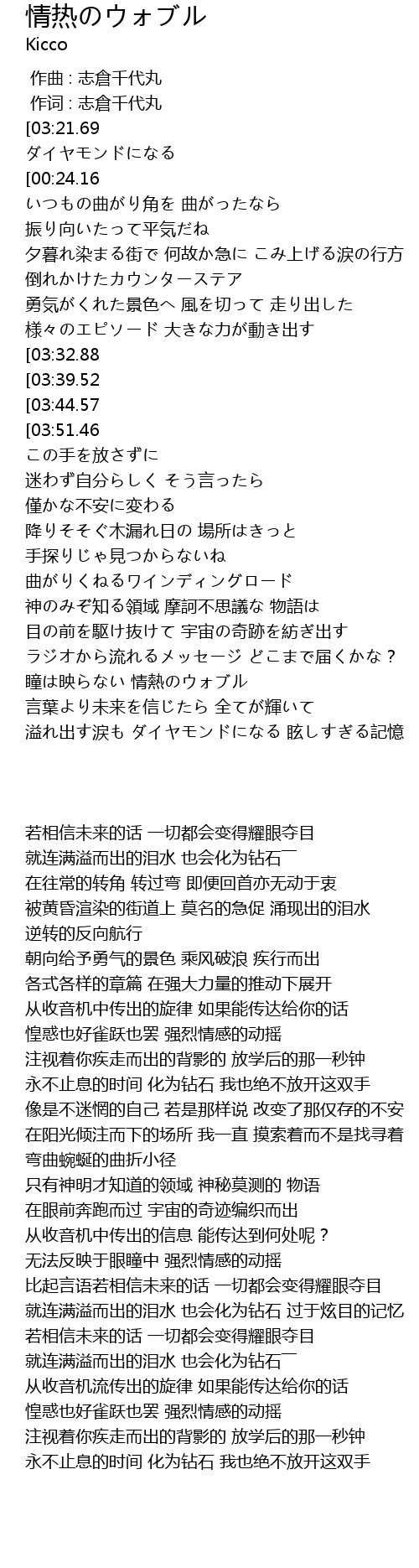 | [01:12.50][03:39.52] | 戸惑いも喜びも 情熱のウォブル |