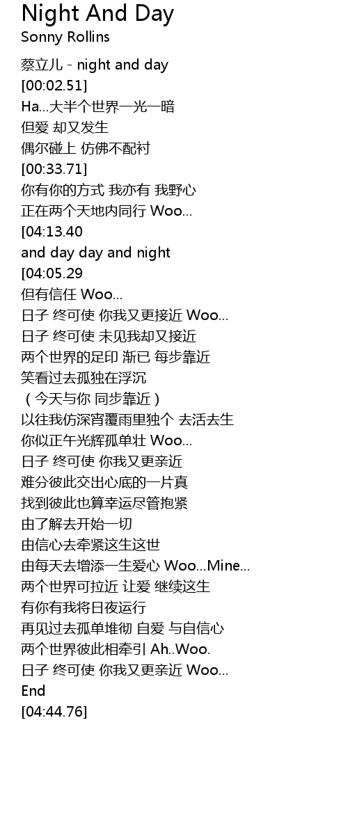 | [04:27.34][04:13.40][03:59.74][03:45.89][03:31.87][01:58.60][01:44.65][01:03.61][00:49.49] | night and day day and night |