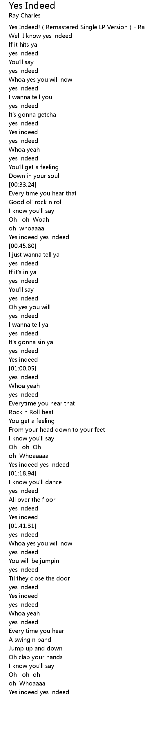 | [00:00.42] | Yes Indeed! Remastered Single LP Version Ray Charles |